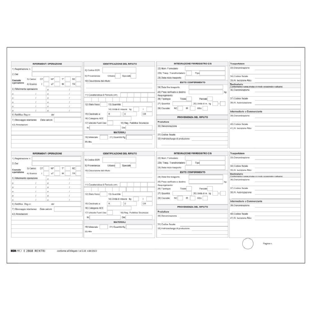 Blocco registro carico scarico rifiuti. Formato: 22x30. Copertina: patinata opaca da gr. 170. Interno: carta uso mano da 60 grammi.