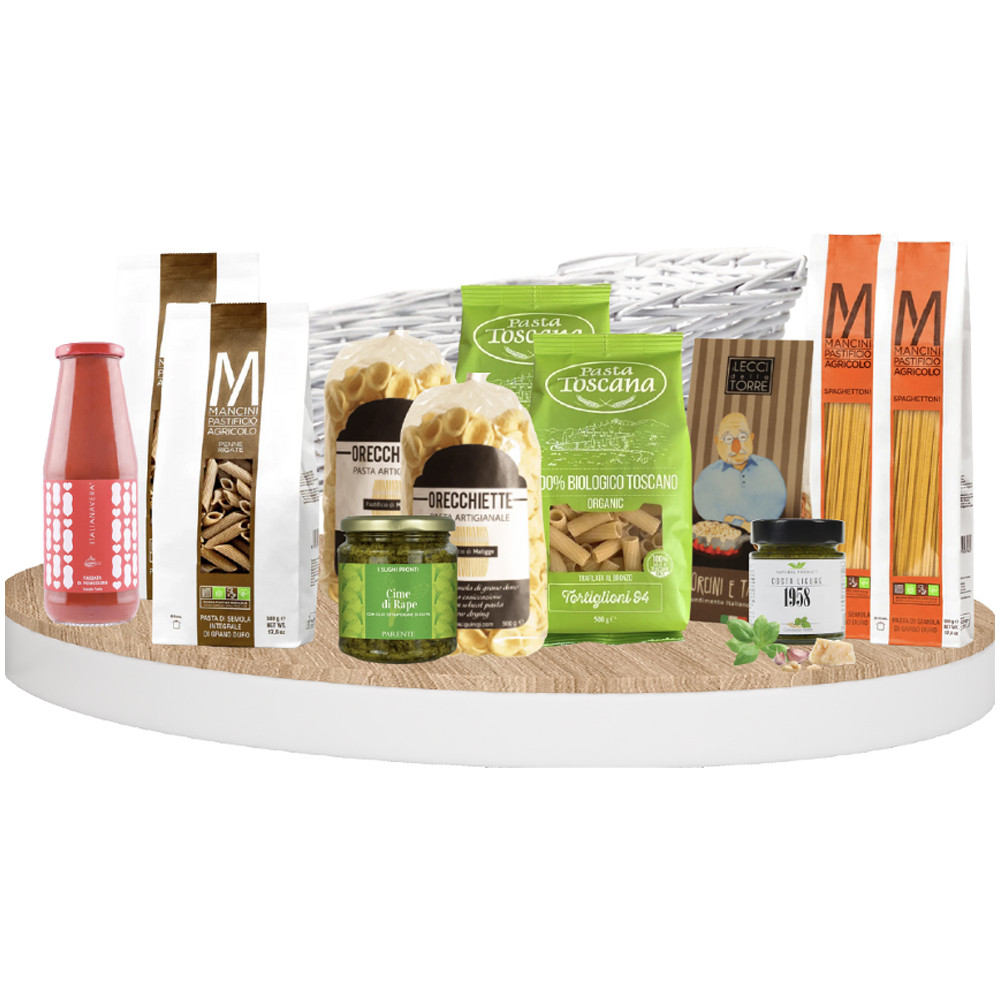 Nr. 1 Contro imballo con carta FSC cesto medio(091) 34x54x37, Nr. 1 Cesto in Vimini Bianco 54,5x36,5x12, Nr. 1 Pluriball spedizione singola, Nr. 2 Spaghettoni Trafilati al Bronzo con Grano Autoprodotto "Pastificio Mancini" 500g (Marche), Nr. 1 Pesto alla Genovese "Costa Ligure 1958" 135g (Liguria), Nr. 2 Orecchiette Artigianali "Pastificio di Matigge" 500g (Puglia), Nr. 1 Cime di Rapa "Parente" 190g (Puglia), Nr. 2 Penne Rigate Integrali Trafilati al Bronzo con Grano Autoprodotto "Pastificio Mancini" 500g (Marche), Nr. 1 Passata di Pomodoro "Italiana Vera" 680g (Campania), Nr. 2 Tortiglioni Bio grano duro 100% Toscano Trafilata in Bronzo "Pasta Toscana" 500g (Toscana), Nr. 1 Condimento Porcini e Tartufo "I Lecci della Torre" 100g (Toscana), Nr. 1 Biglietto da "GBR"