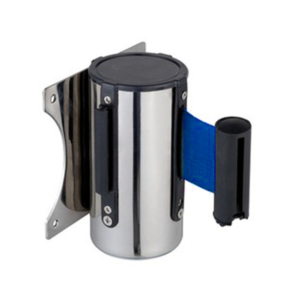Attacco murale cromato con nastro retrattile blu, da agganciare ad una colonnina di delimitazione. Ideale per aree aperte al pubblico, per un maggior ordine e rispetto della privacy. Nastro blu estensibile fino a 180 cm con altezza di 4,8 cm, aggancio in acciaio con dimensioni di (L) 16 x (P) 9 x (H) 21 cm.